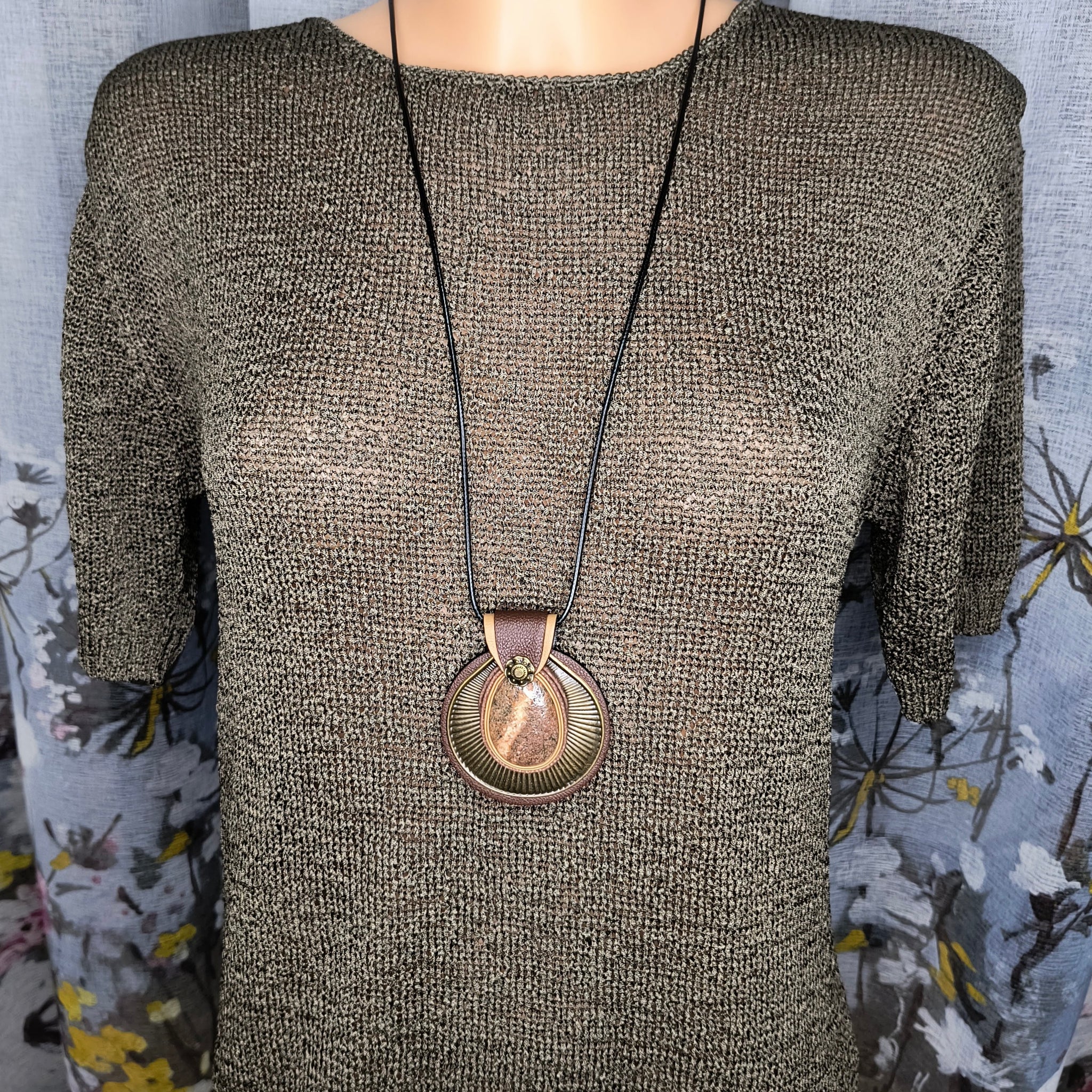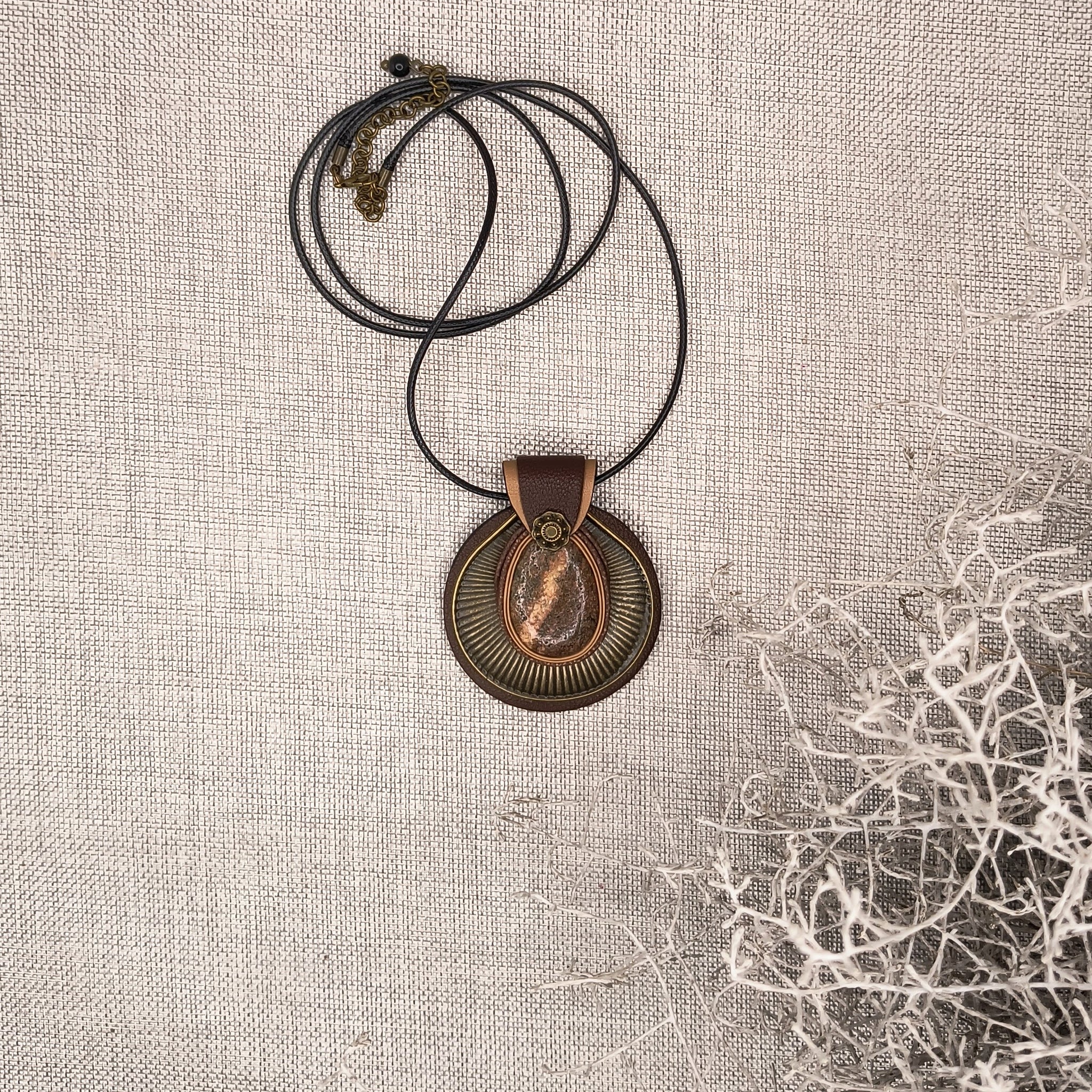 Rankų darbo papuošalas pagamintas iš natūralios odos, žalvarinių detalių ir natūralaus akmens. Šis vienetinis akmuo yra iš baltijos jūros.