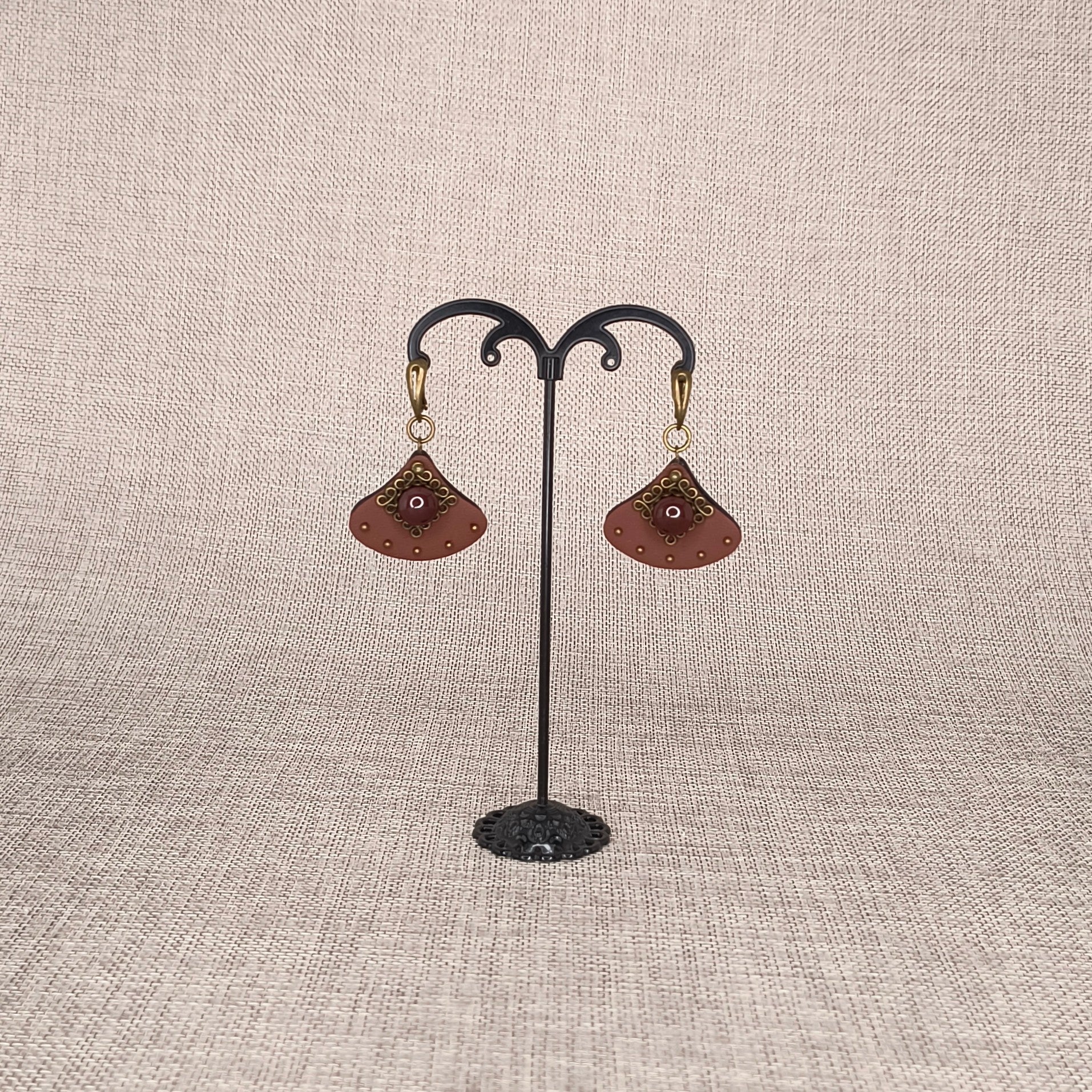 Rankų darbo auskarai pagaminti iš natūralios odos, žalvarinių detalių ir agato akmens.
