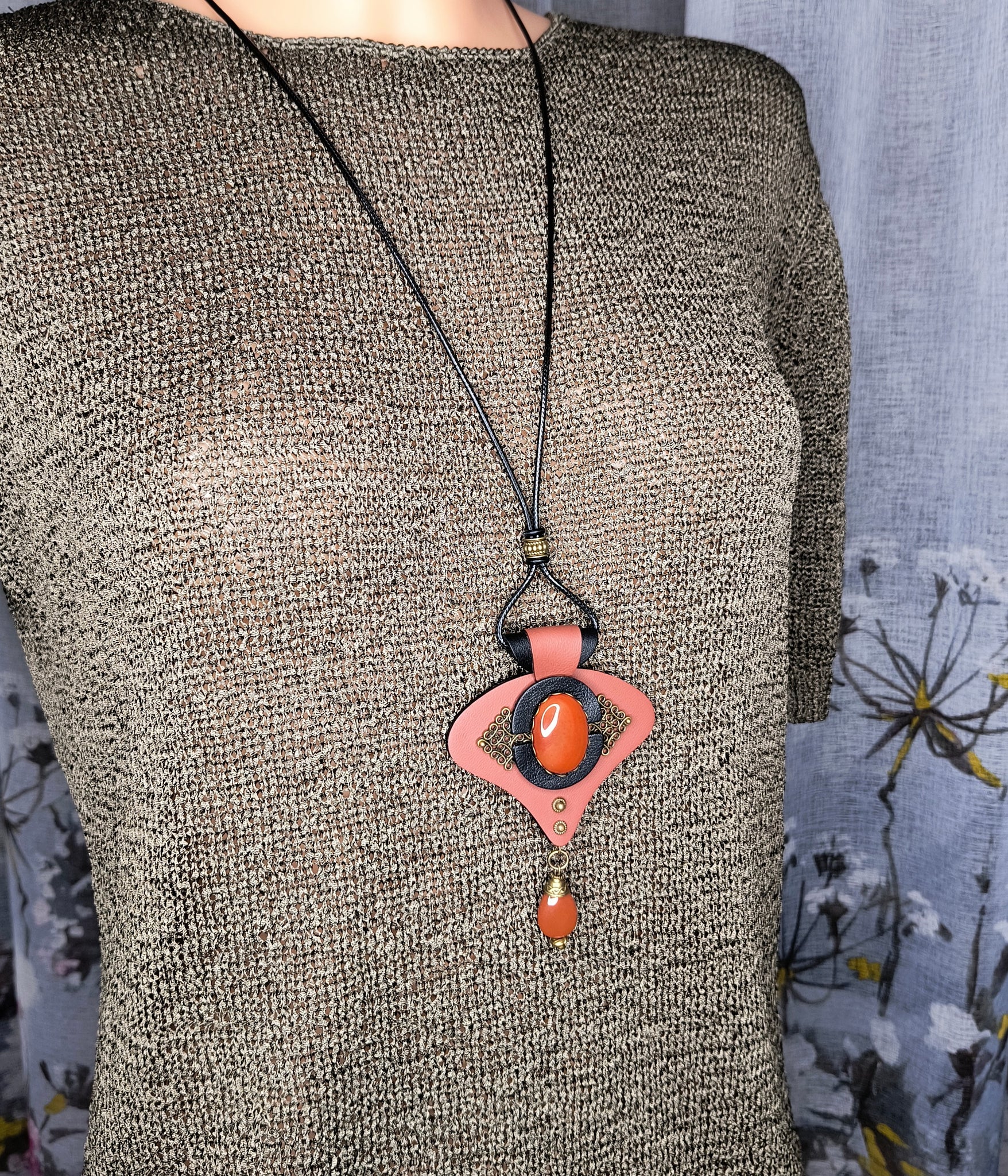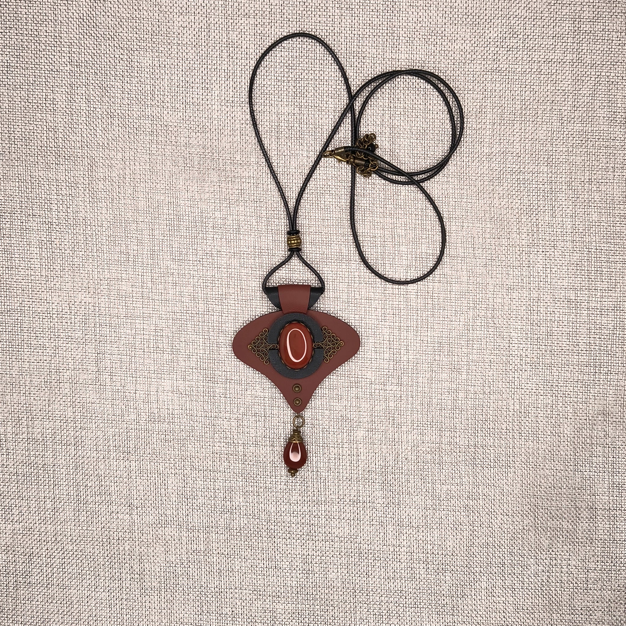 Ilgas kaklo pakabukas pagamintas iš natūralios odos, žalvarinių detalių ir agato akmens.