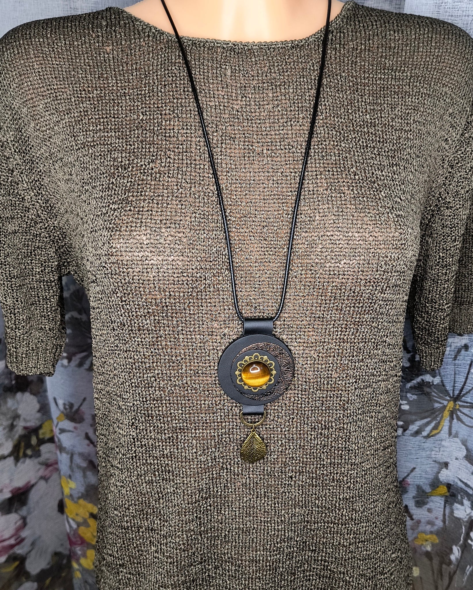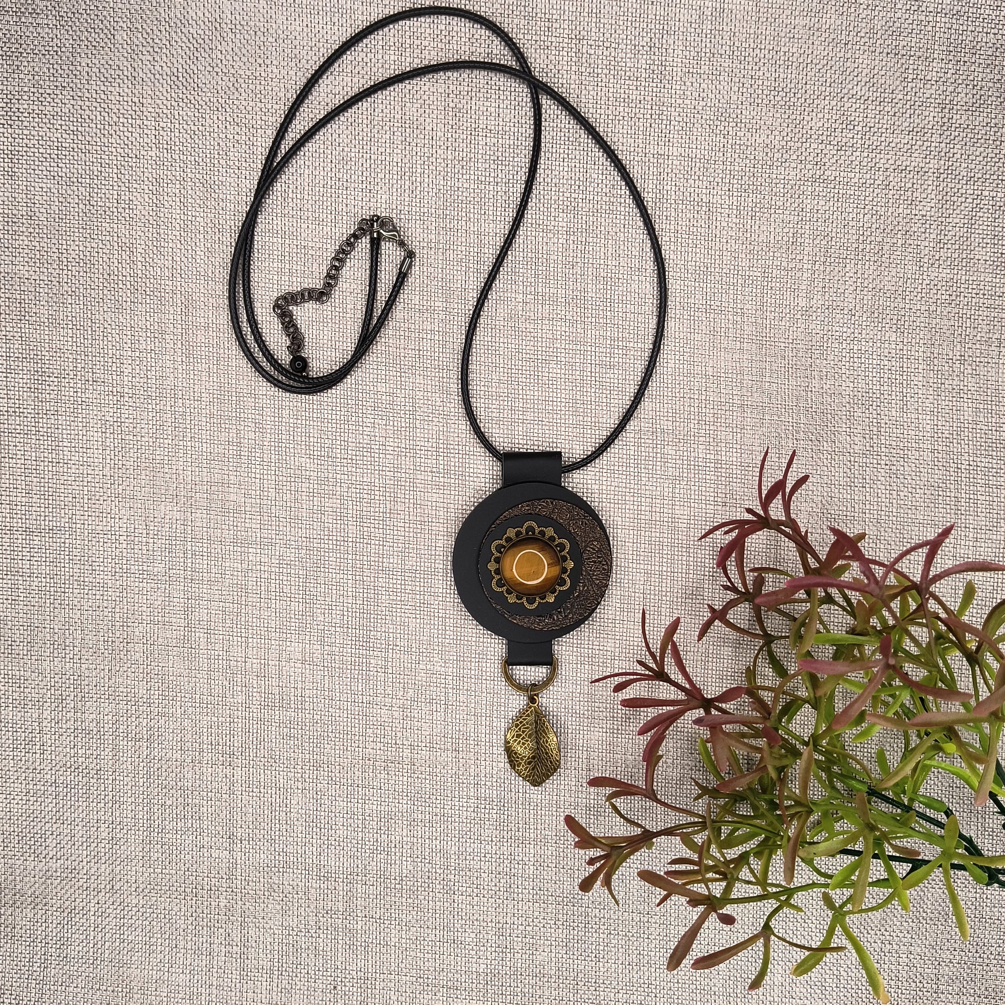 Ilgas kaklo pakabukas pagamintas iš natūralios odos, žalvarinių detalių ir natūralaus tigro akies akmens.