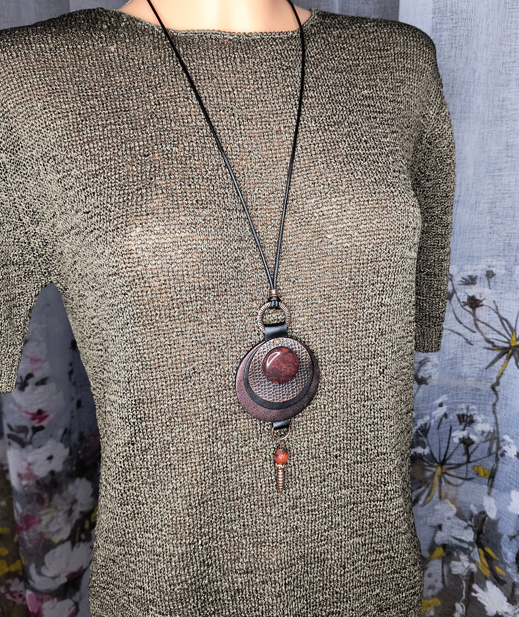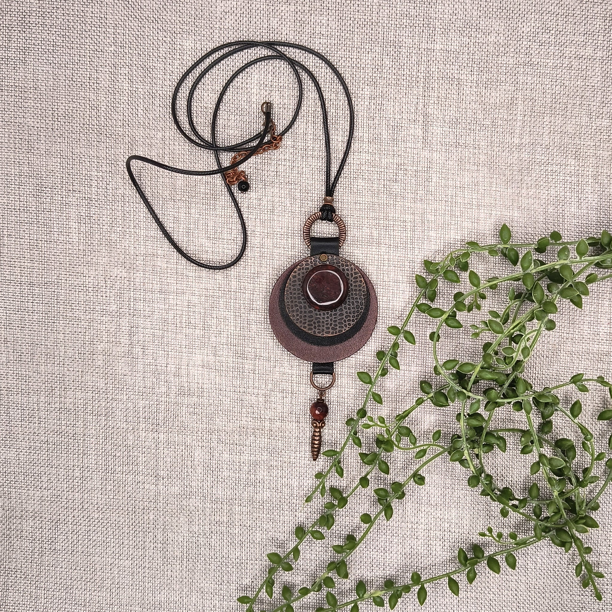 Rankų darbo papuošalas pagamintas iš natūralios odos, varinių detalių ir jaspio akmens.