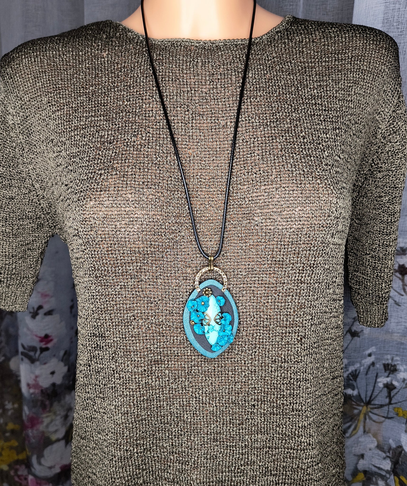 Vienetinis, rankų darbo papuošalas pagamintas iš natūralios odos, žalvarinių detalių ir natūralaus turkio akmens.