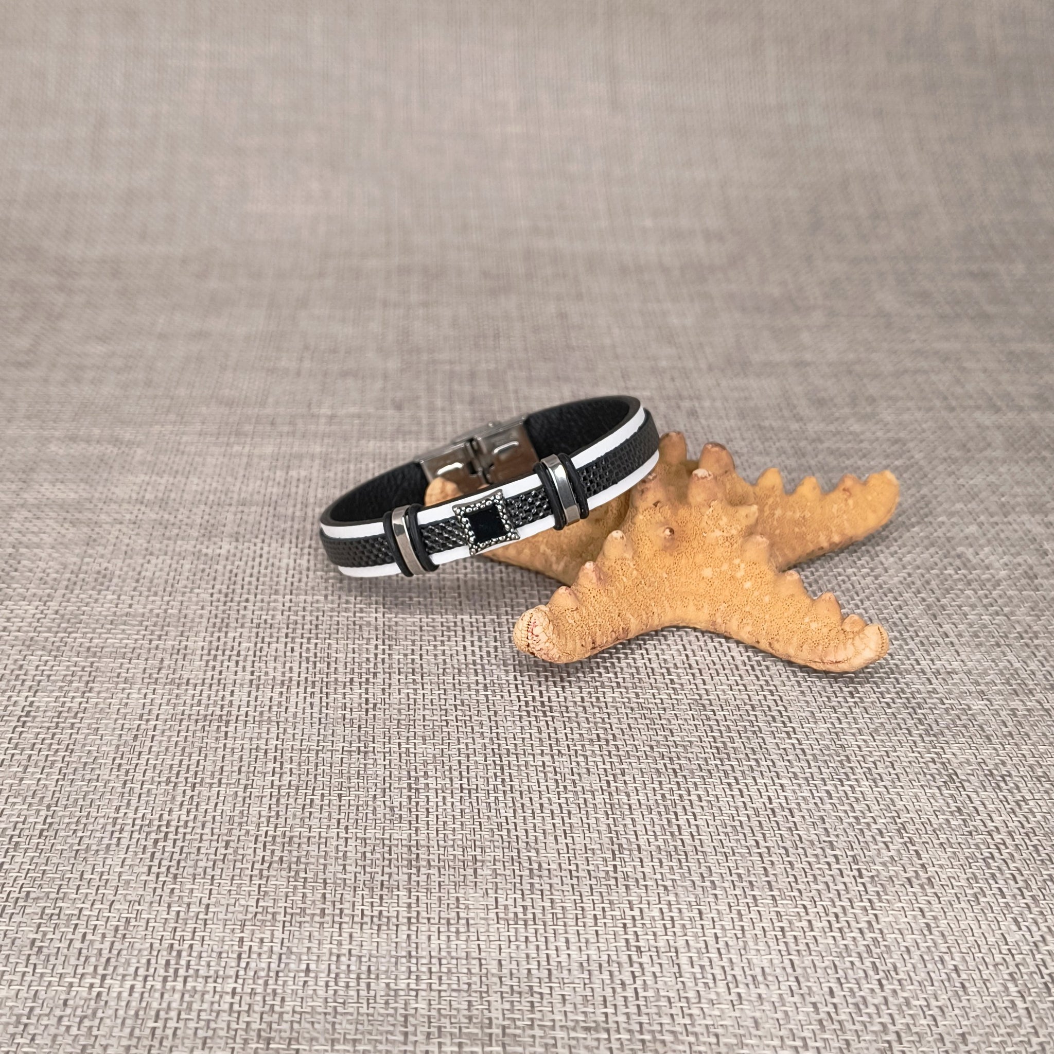 Natūralios odos, rankų darbo apyrankė dekoruota nerūdijančio plieno detalėmis.