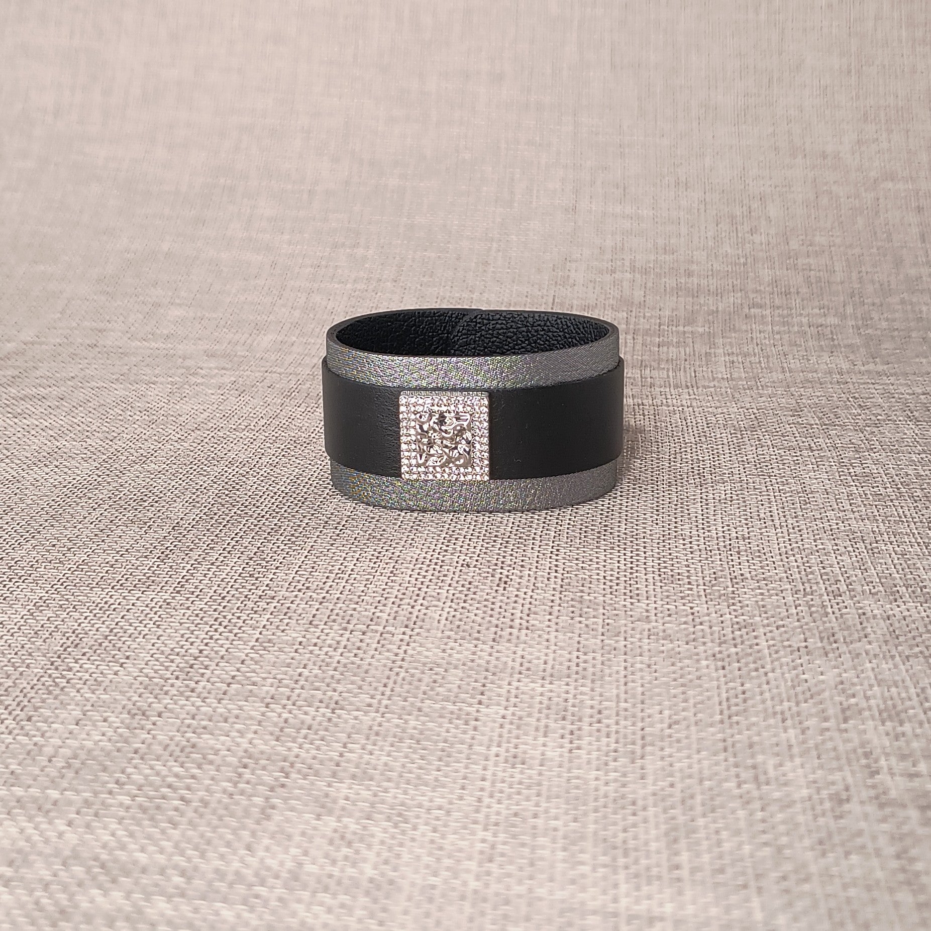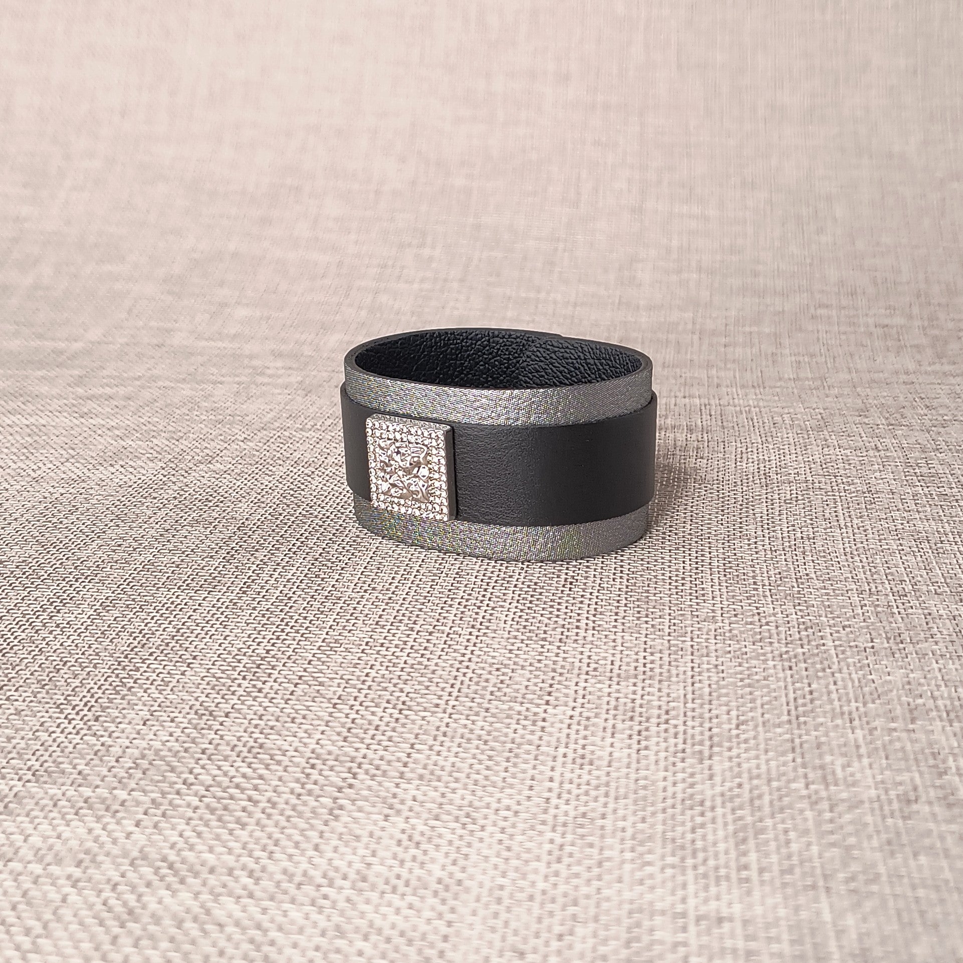 Natūralios odos, rankų darbo apyrankė dekoruota metaline detale su stiklo kristalų akutėmis.