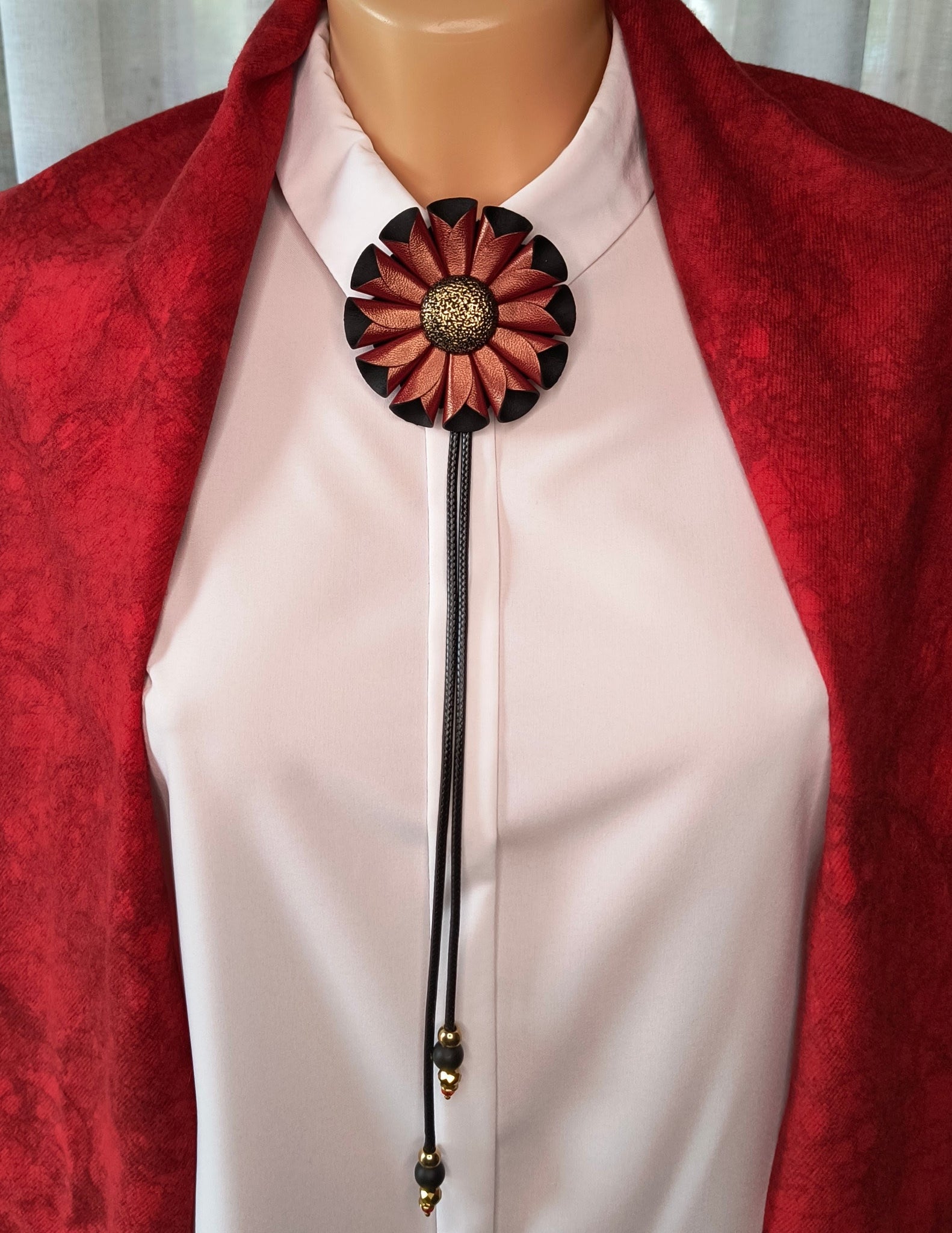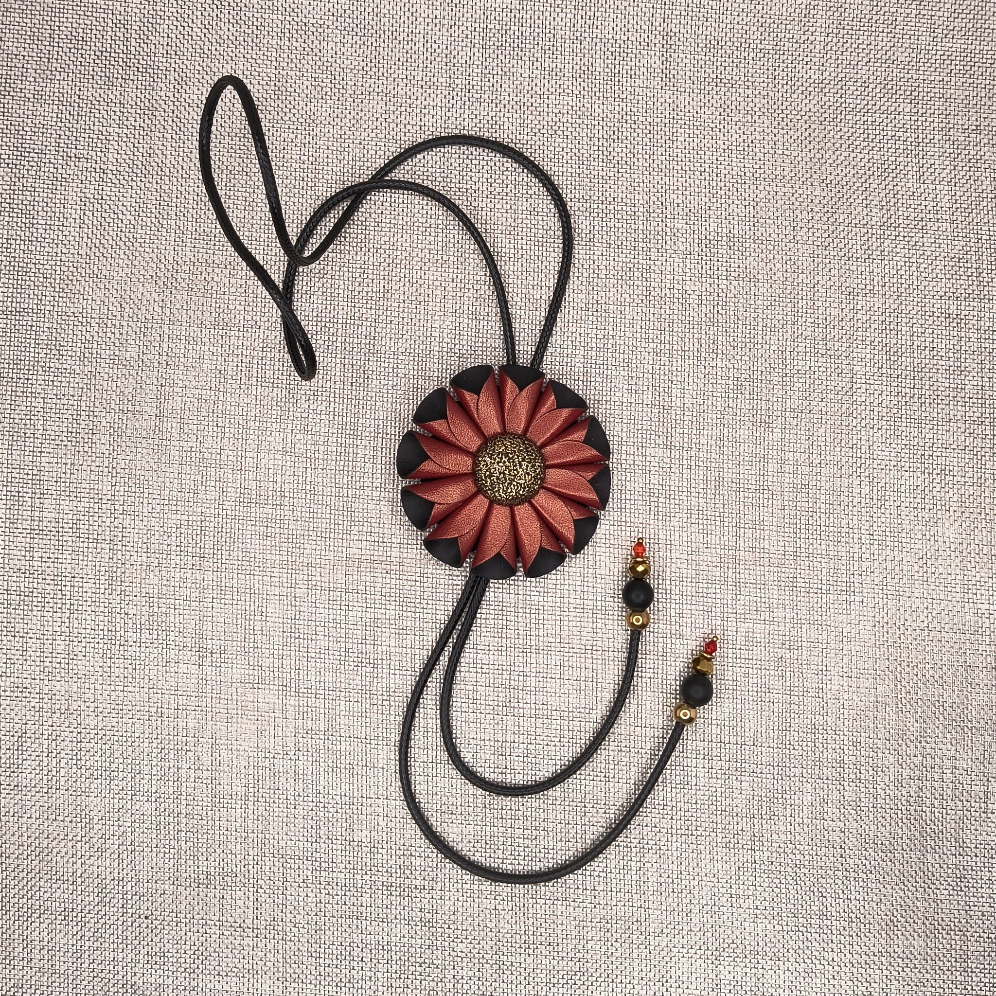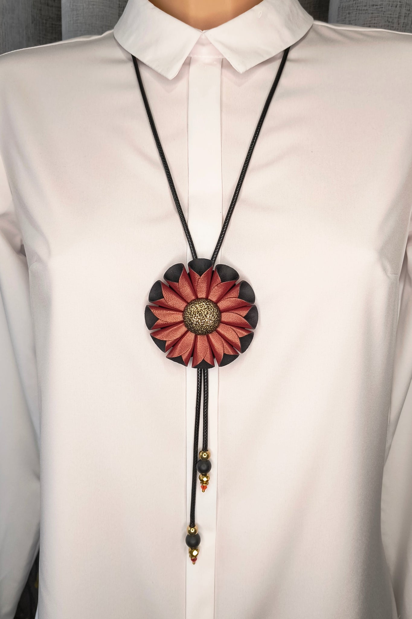 Rankų darbo papuošalas pagamintas iš natūralios odos, aukso spalvos metalinių detalių ir stklo karoliukų.