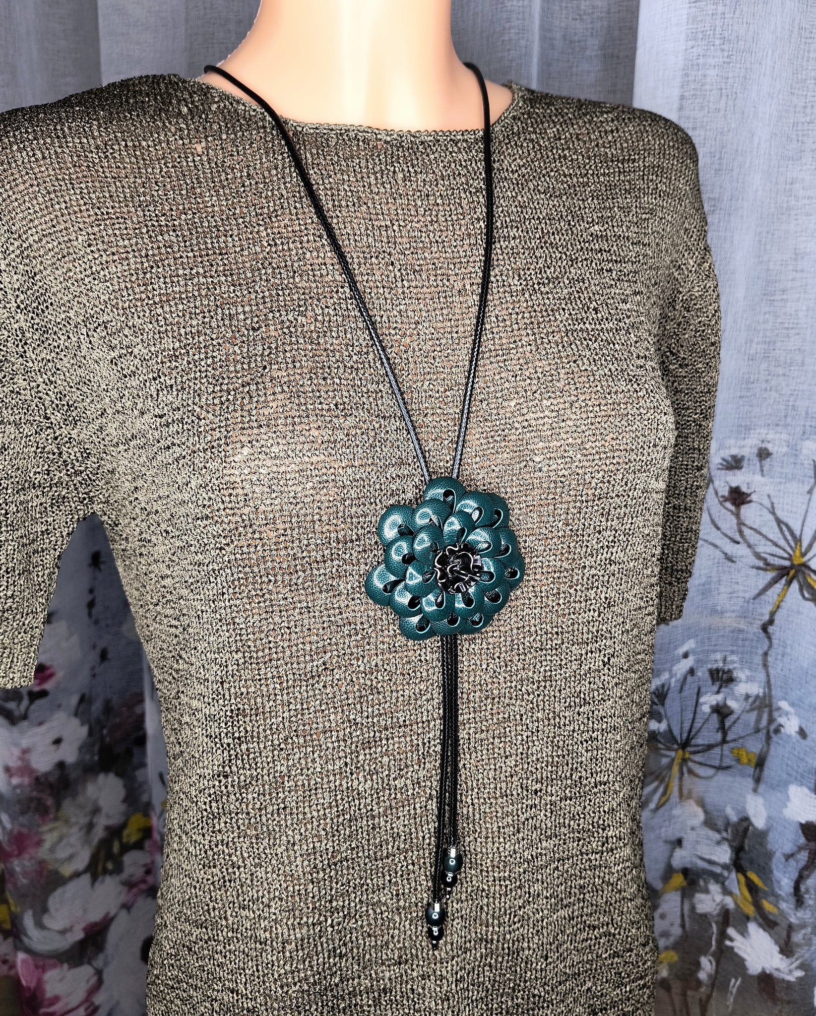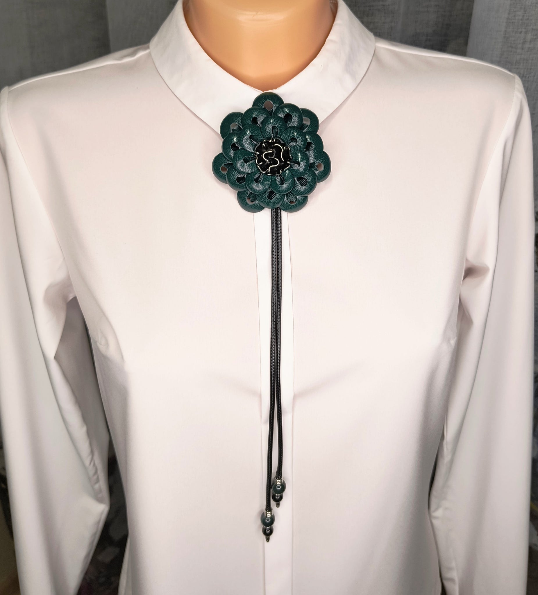 Rankų darbo papuošalas pagamintas iš natūralios odos ir metalinių detalių.