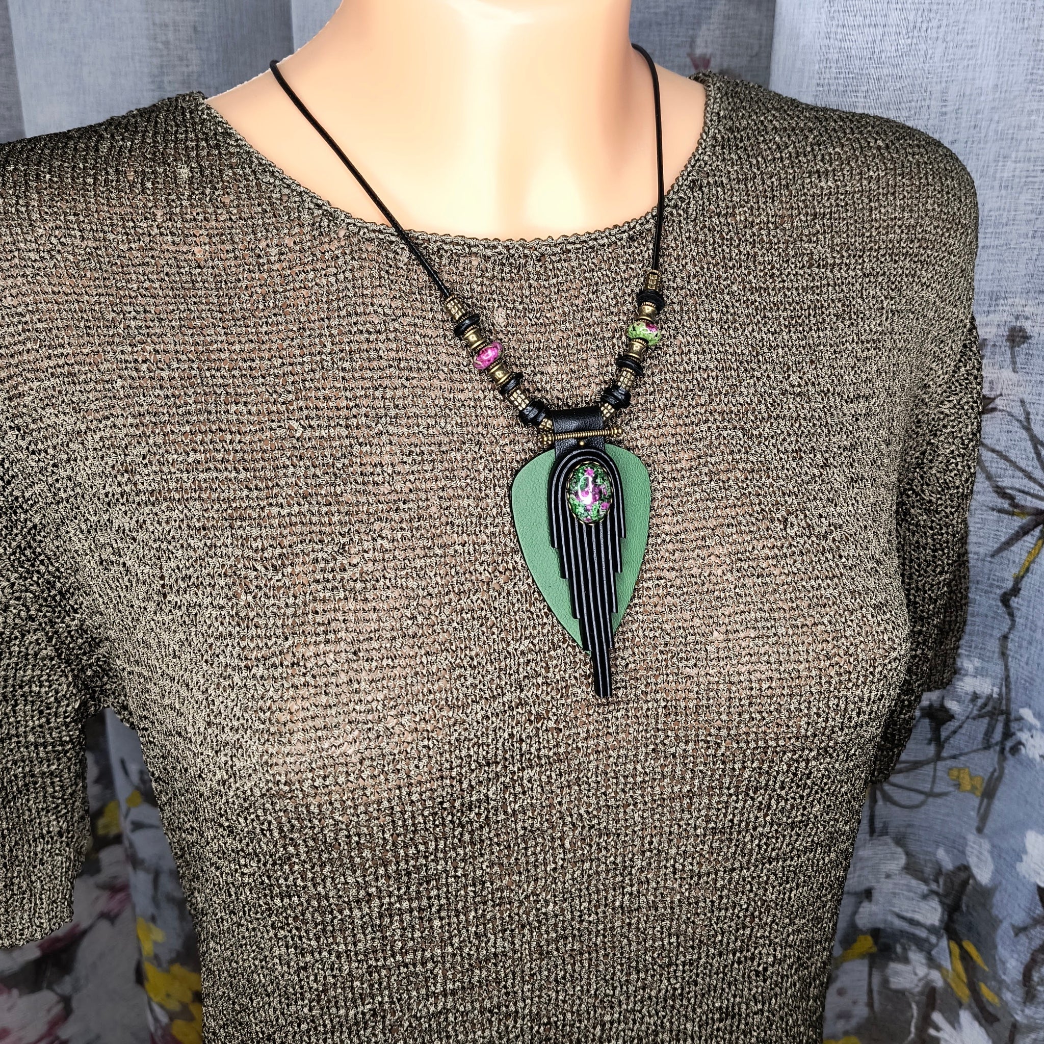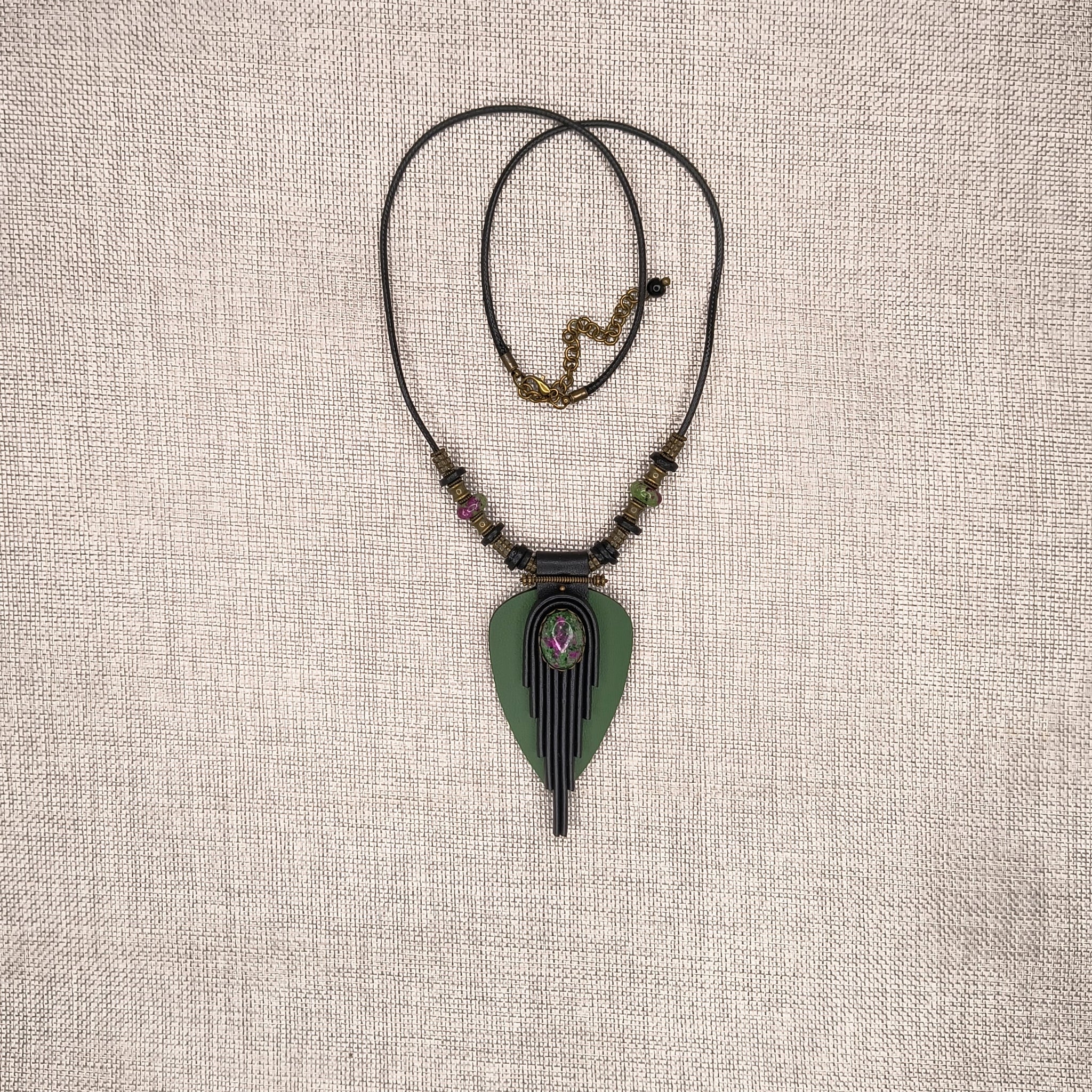 Rankų darbo pakabukas pagamintas iš natūralios odos, žalvarinių detalių ir zoisito su rubino kristalais akmens.
